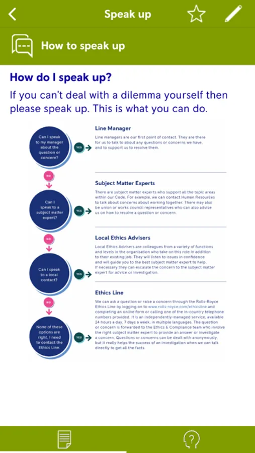 We also provide details on our TRUST model that is a decision making framework you can use if facing a dilemma and information of our speak up channels for individuals who wish to raise any concerns. The app now also includes interactive dilemma exercises that allow you to vote on how you would deal with an ethical issue.