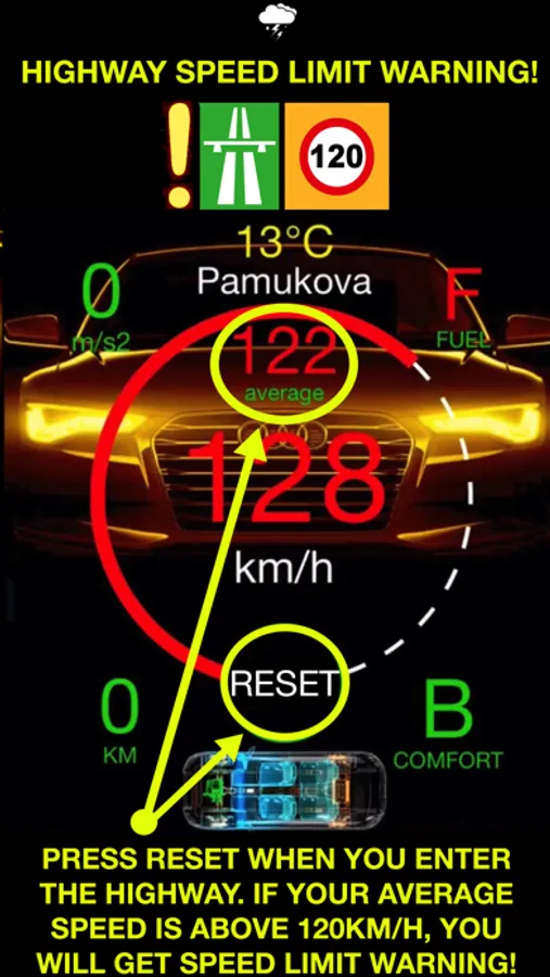 • Press RESET button when you enter the highway. If your average speed is above 120 km/h, you will get speed limit warning.