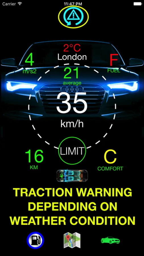 • If you push the gas pedal and accelerate too much according to the calculated road friction coefficient (depending on weather), you will get Traction Warning. It is designed for dry, wet and snowy asphalts (Artificial Intelligence).