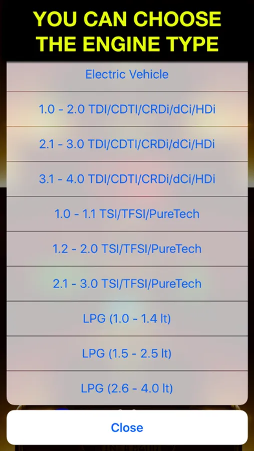 • You can select the engine types from the fuel button in the left bottom corner. The default engine type is 1.6 Turbo Diesel. The other options: