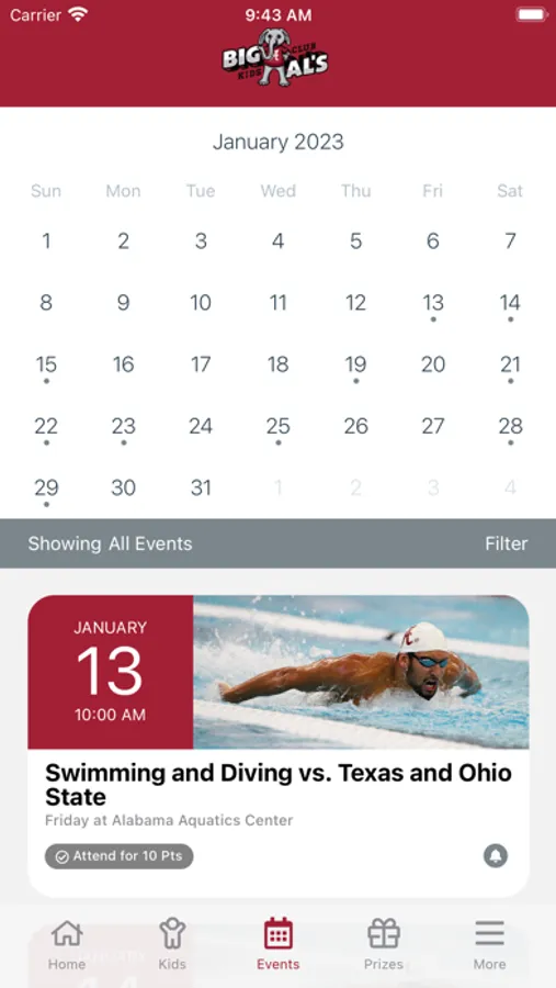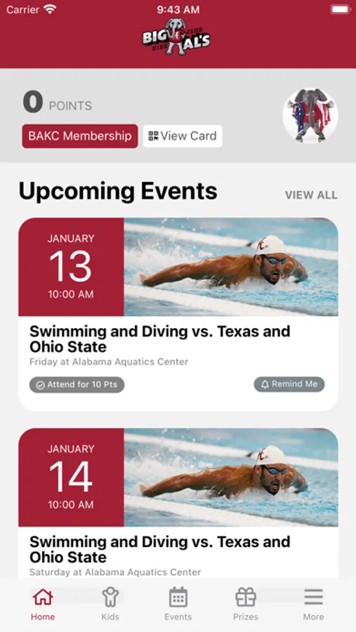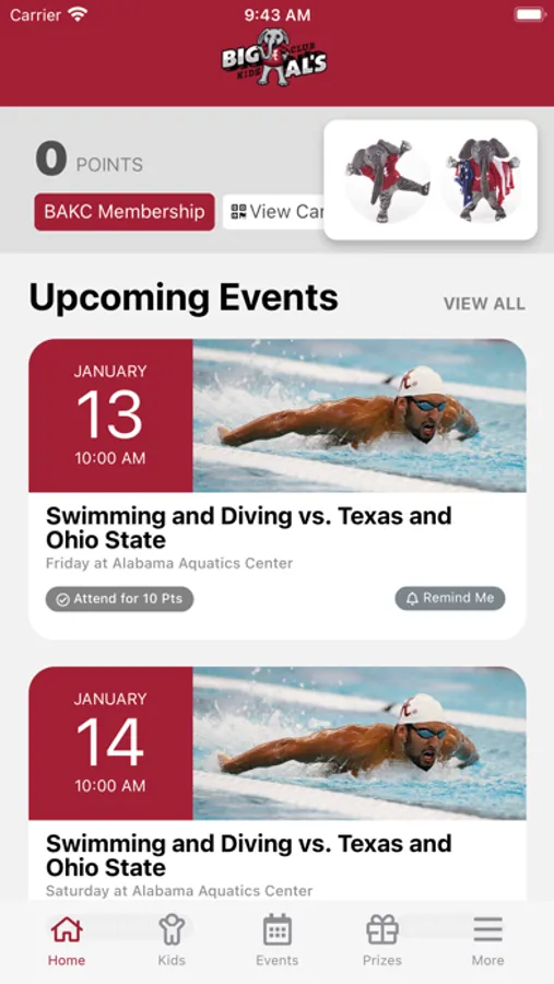 Big Al’s Kids Club is the best club around for young Bama Fans to show their Crimson Tide Pride! It is the official Kids Club of Alabama Athletics and free for all kids 12 and under. It exists to provide opportunities for children to engage with Alabama Athletics in a meaningful and fun way. Through Big Al’s Kids Club, children will receive points for attending athletic events to redeem exclusive BAKC prizes and a discount on birthday packages during their birthday month. Children will be encouraged to attend at least one soccer match, volleyball, men’s basketball, women’s basketball, softball, baseball game and gymnastic meet by completing their punch card to earn an exclusive BAKC prize pack not available in the prize store. Not to mention members will receive a personal invitation to Big Al’s Birthday Party! Big Al’s Kids Club is meant to engage children in the world of Alabama Athletics in such a way that brings them back every year and brings excitement to their experience!