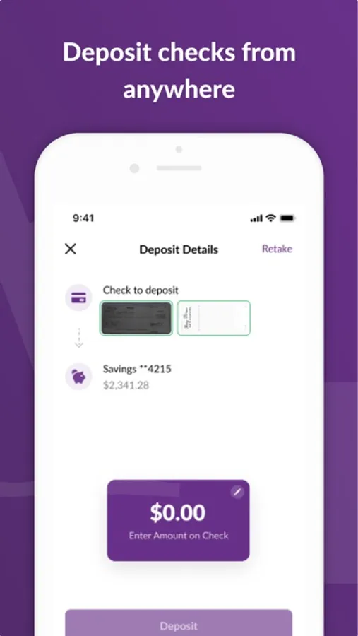 • Deposit checks from anywhere, and immediately access up to $1,500 of the funds