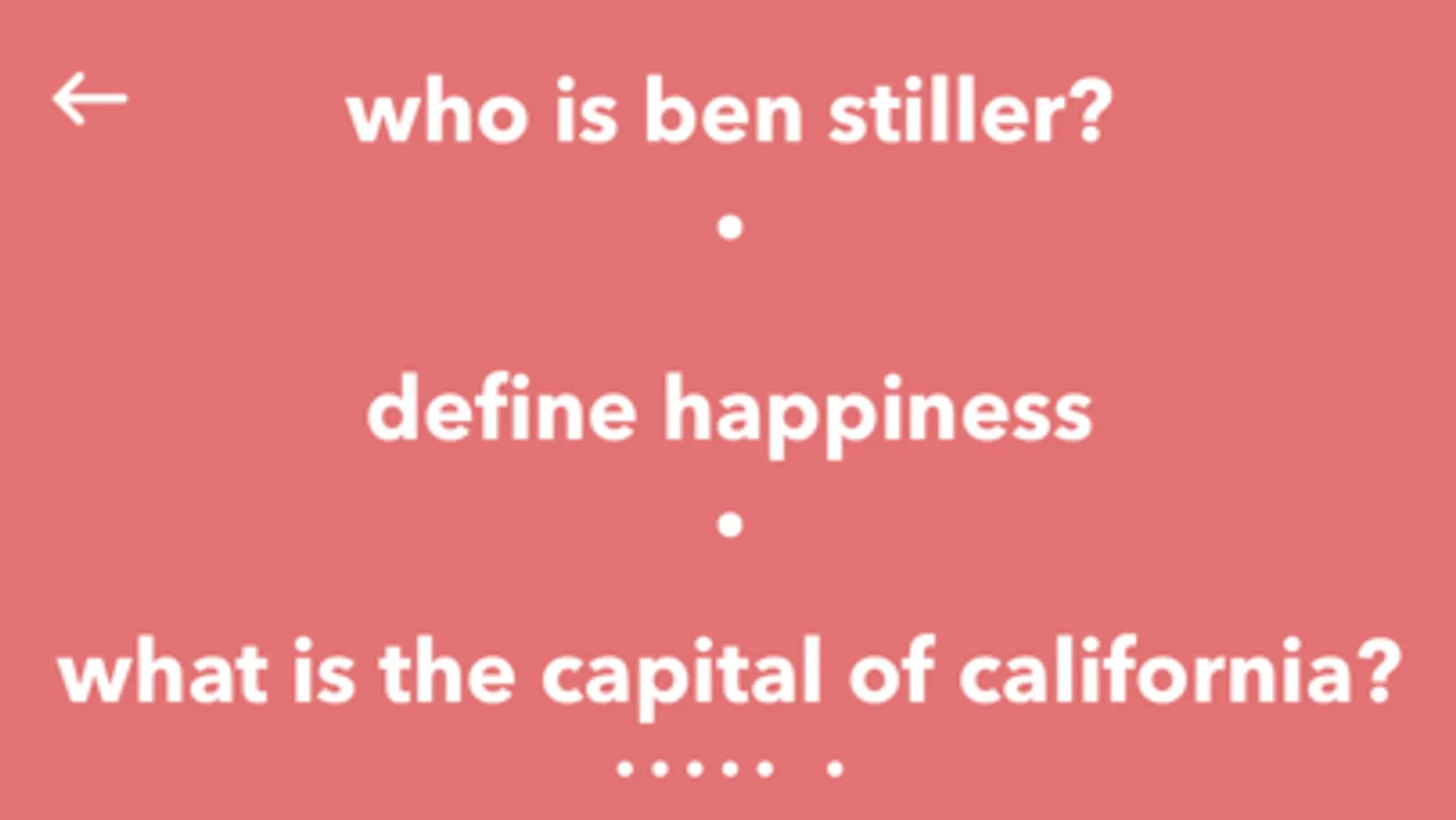 Not sure where to start? Try asking some starter questions, such as: Tell me about Sesame Street. Who is Ben Stiller? How many miles in 7 kilometers? What is the meaning of charming? Define global warming. What is the Tour de France? What is the time in Melbourne, Australia? What is 7 divided by 2? Question: 9 times 8?