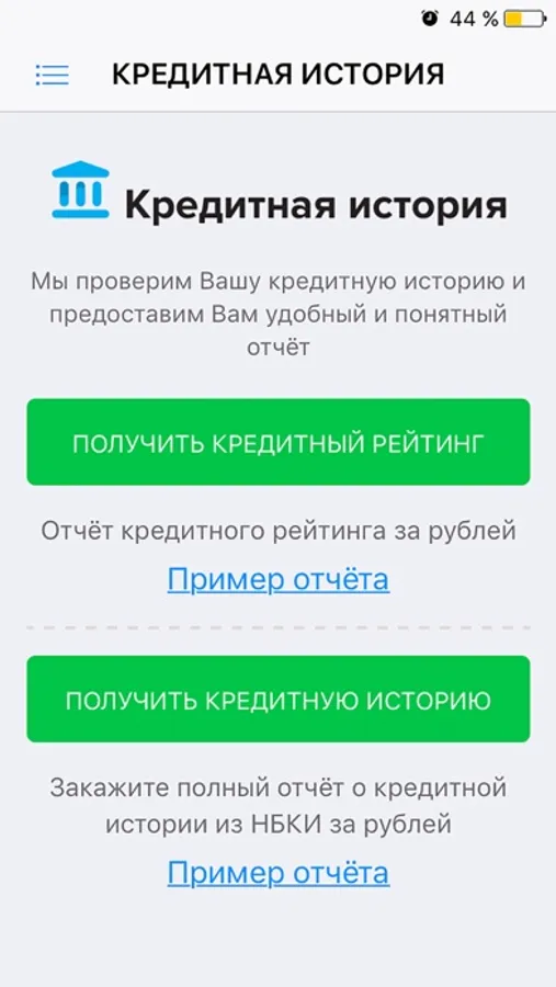 Приложение "Кредитная история" предлагает пользователю воспользоваться двумя услугами: