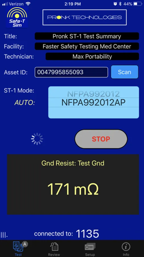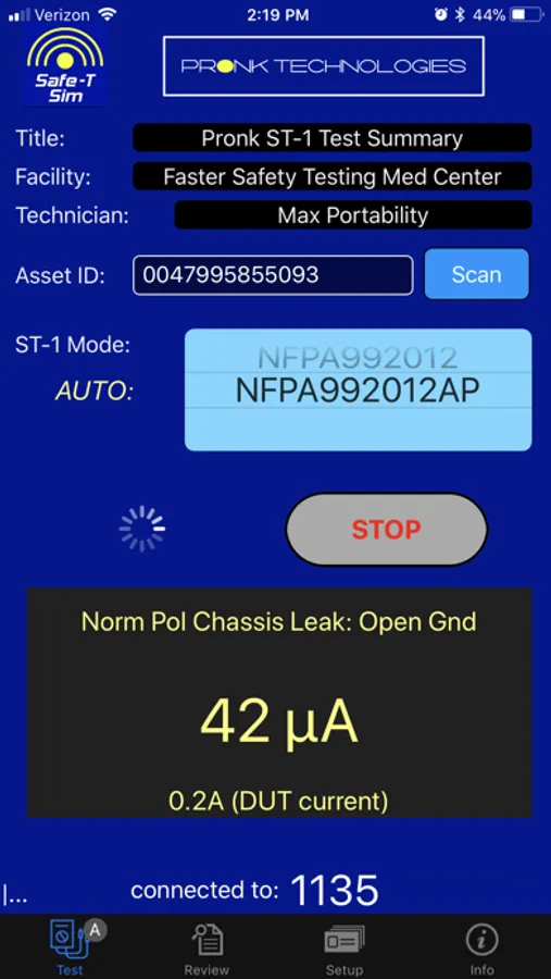 Real-time streaming measurements are displayed directly on your iPhone or iPad during automated testing. In the App, users can scroll to the desired test profile, tap the App Start icon, and the App automatically builds your electronic test report while the Safe-T Sim runs the programmed tests. The finalized test report combines the details you need—e.g., Asset ID via App-integrated bar code scanner, Facility and Technician Name, Safe-T Sim model and Serial Number, as well as automatic time and date stamp of each record.