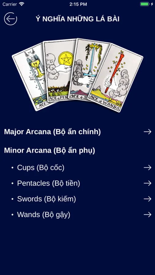 - Pentacles: Kim Ngưu, Xử Nữ, Ma Kết
