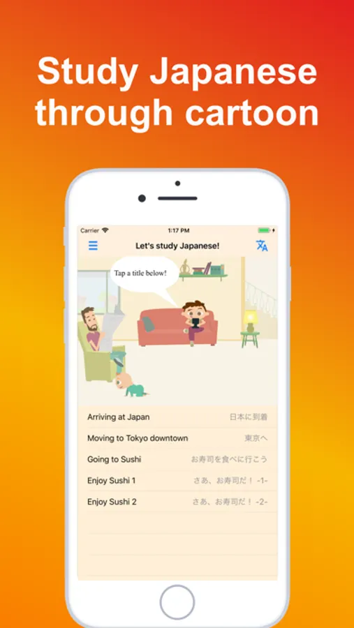 You will read manga stories and learn Japanese language at the same time. Scripts in manga content are shown in English. It will be easier for you to understand the story. Corresponding Japanese scripts are shown in the same screen. If you tap Japanese scripts, your device will read it. You can learn Japanese texts and how to say it easily.