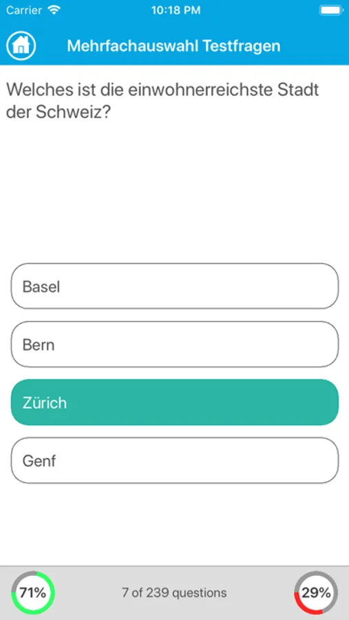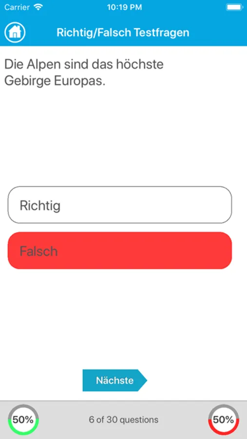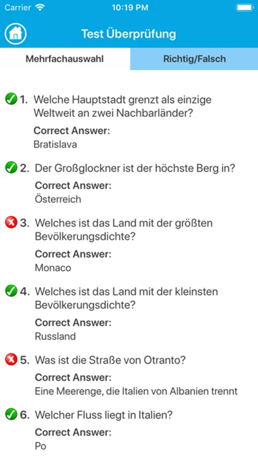 - Es gibt 2 Quiz-Modus. Multiple-Choice Quiz and Richtig/Falsch Quiz.