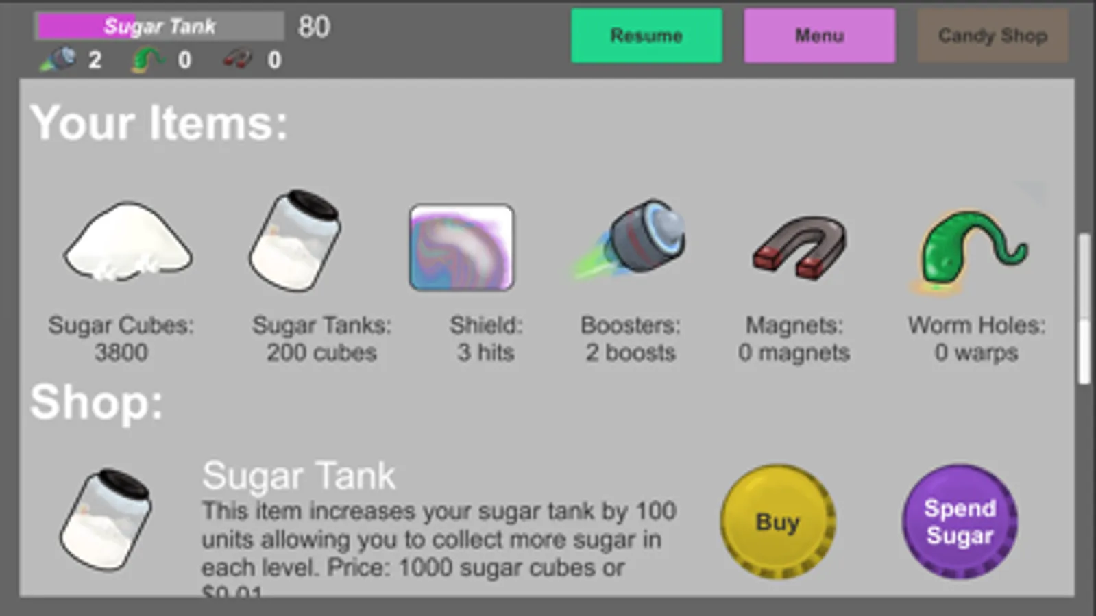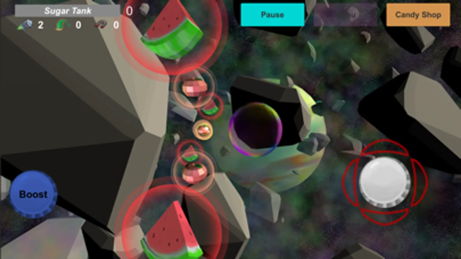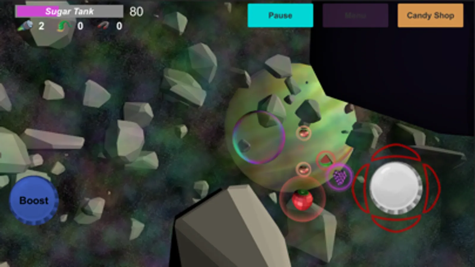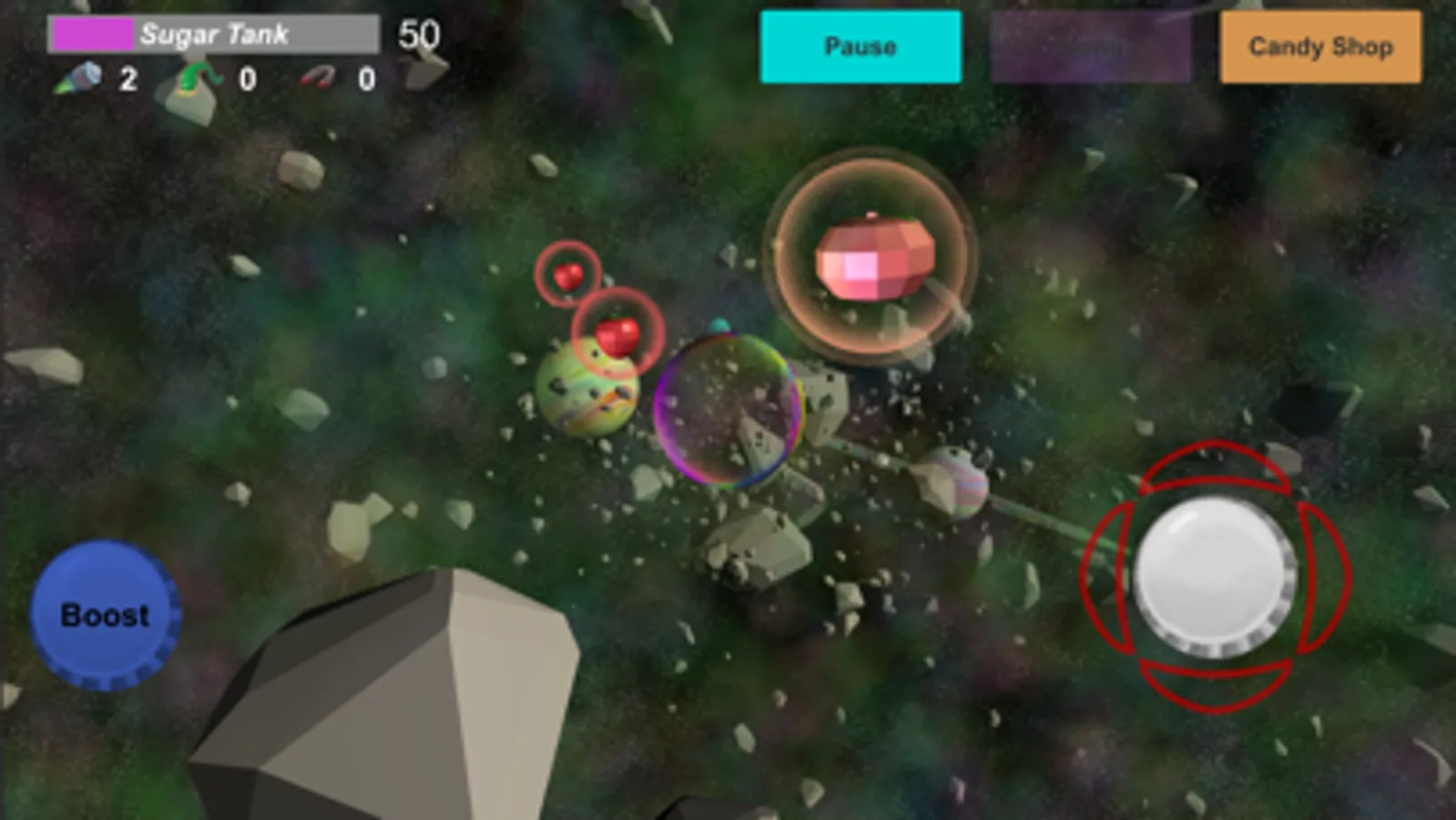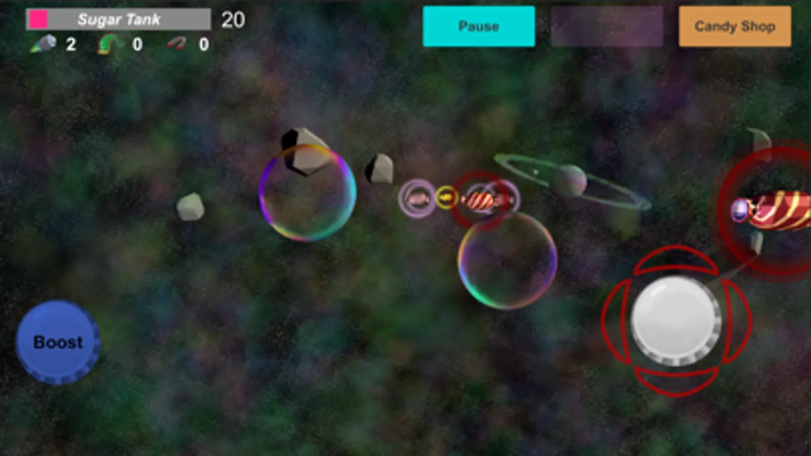 You are a bubble in space! Surviving on sugar you need to navigate through astroid belts to collect candies. Don't hit an asteroid you may pop! Use special powers to beat levels. Collect sugar to get powers.