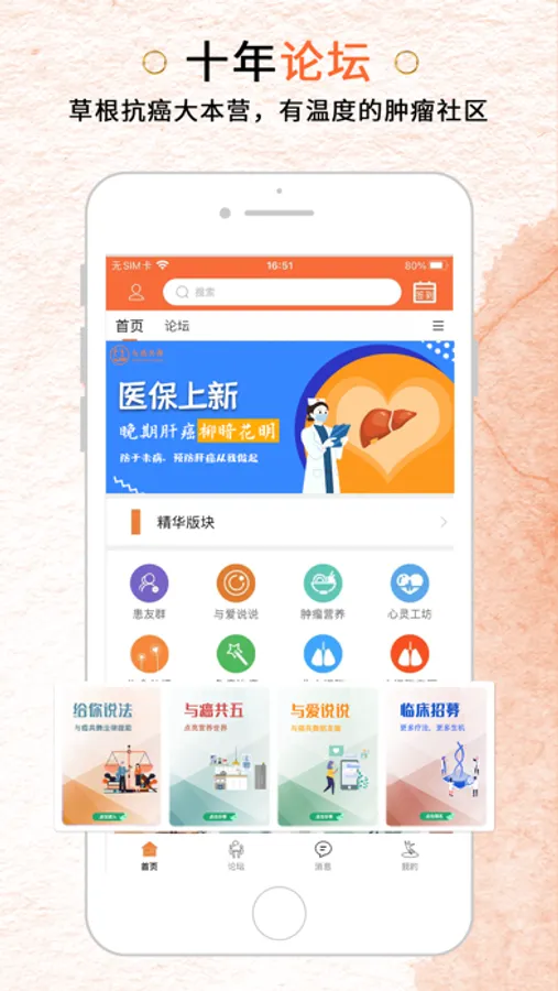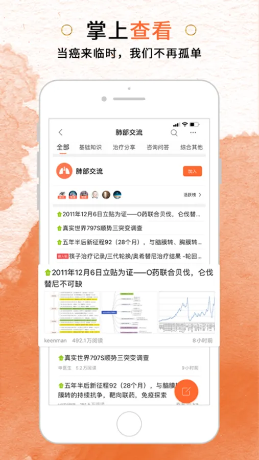 与癌共舞论坛是国内领先的肿瘤患者公益交流平台,成立于2010年,是草根抗癌的大本营。每天,近10万名患者和医药专家在此交流分享治疗康复的前沿信息与心得体会,一起积极寻找最新的治疗信息,讨论各种治疗手段,共享治疗得失,学习各种抗癌知识,寻找适合自己的治疗方案。