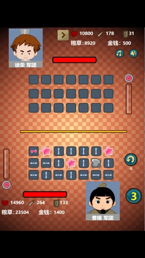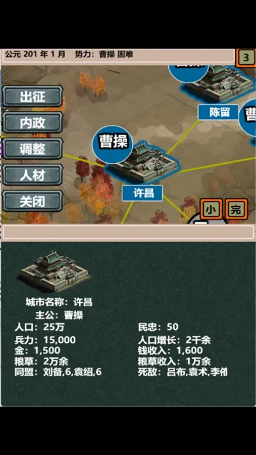 首创三消与模拟战争游戏的结合,三个竖向为进攻,三个横向为防御,这样让玩家有发挥空间,做到合理布置可以以弱胜强,从而模仿出更好的古代战争感觉。军团由三个武将的能力构成,主帅能力决定进攻与防御值,军师决定刷新数量,先锋官给进攻加成。让玩家有兴趣去收集更好的武将。大地图还原三国时期的各个城池,玩家要可进行内政、外交、战争等多项发展选择,让玩家有充分的发挥空间。