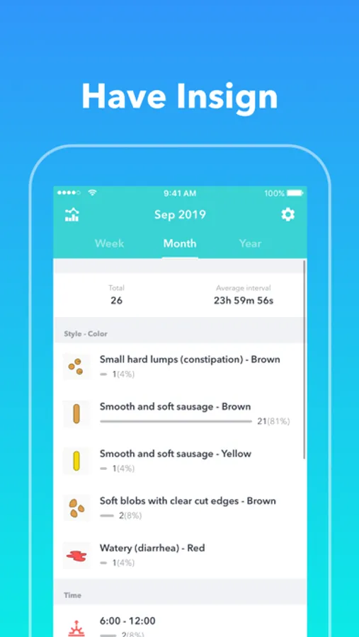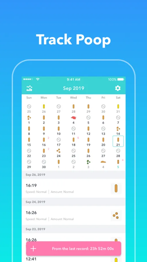 - View a data breakdown and graph of your poop statistics over time including metrics like when your bowel movements happen and a day by day history.