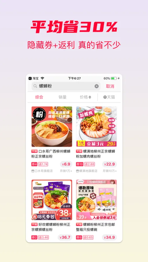 通过省钱酱去淘宝、天猫、京东购物,下单后享返利,最高返50%,急速到账,随时提现到支付宝。