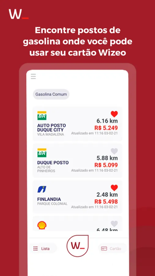 A nova funcionalidade do aplicativo Wizeo permite que você localize os postos de gasolina mais próximos de sua localização que aceitam o cartão Wizeo e pesquise os preços de combustível mais baratos da região.