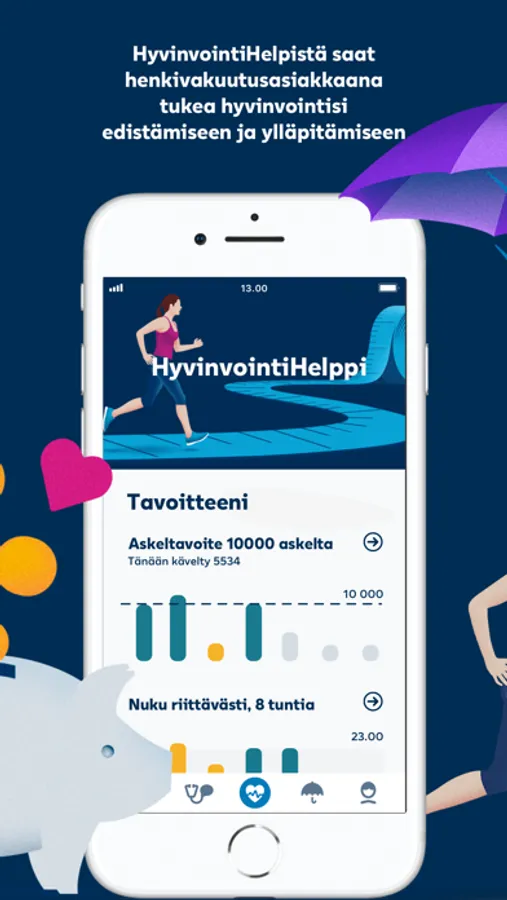 The HyvinvointiHelppi included in the TerveysHelppi app helps you promote and maintain your well-being. In the HyvinvointiHelppi, you can e.g. monitor your activity and sleep, and get support to promote and maintain your well-being. HyvinvointiHelppi is available for life insurance customers. HyvinvointiHelppi uses the step and sleep data of the Health app in your phone.