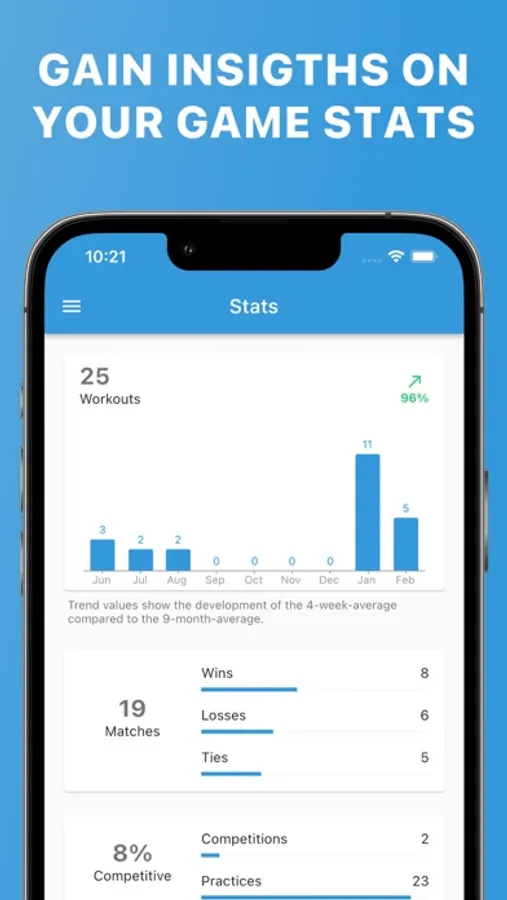 Analyze your matches and gain insights into your playing style. The app uses your match data to summarize and aggregate meaningful stats, so you can see your improvements and further progression.