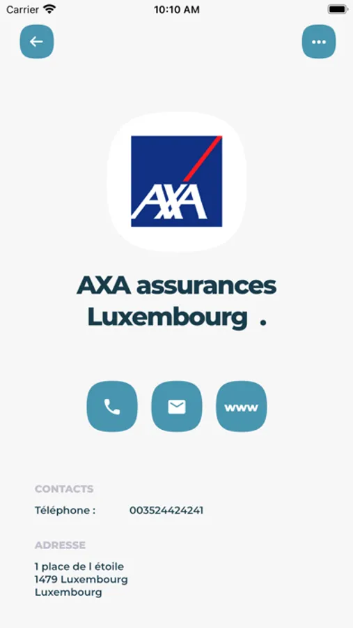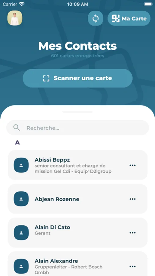 Digital business card: Add contact by Scan, List of contacts, Synchronization to iPhone Contacts, Profile, Login screen, Purchase in App for the creation of a profile without advertising, notifications to contacts during a modification important personal data.