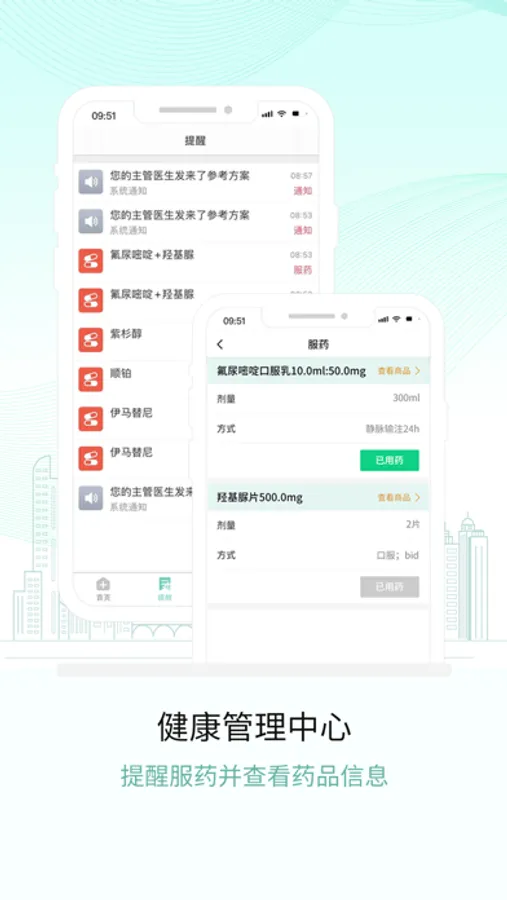肿瘤化疗助手患者端,方便患者接收主管医生的健康管理信息;包括医生的医嘱提醒、服药提醒及相关药品的商品信息传输,购买疾病相关药物更便捷。