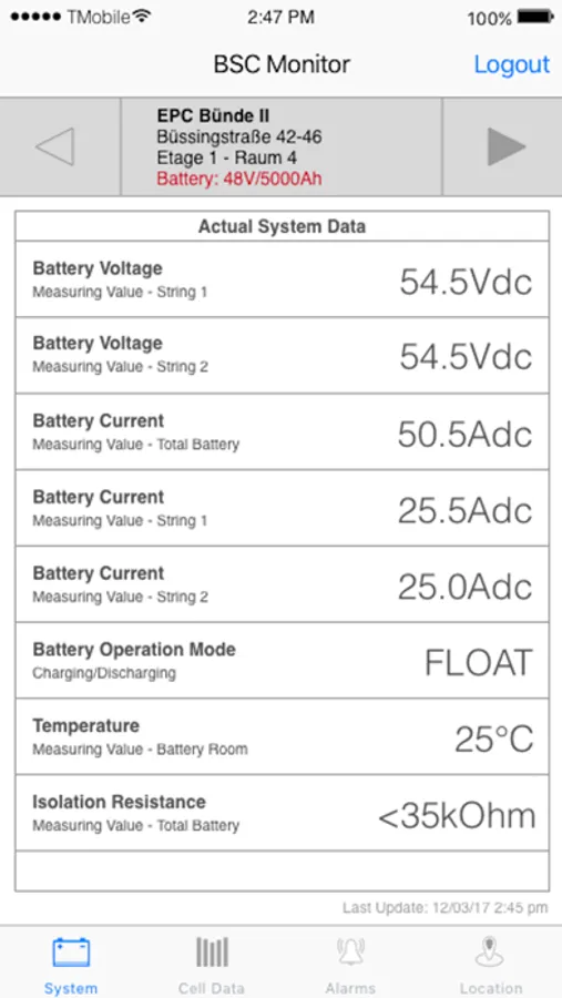 - Shows actual system measuring data (battery voltage and current, battery string voltages and currents, battery room temperature, battery cell voltages and temperatures, discharged and charged energies of battery strings and single cells, isolation resistance)