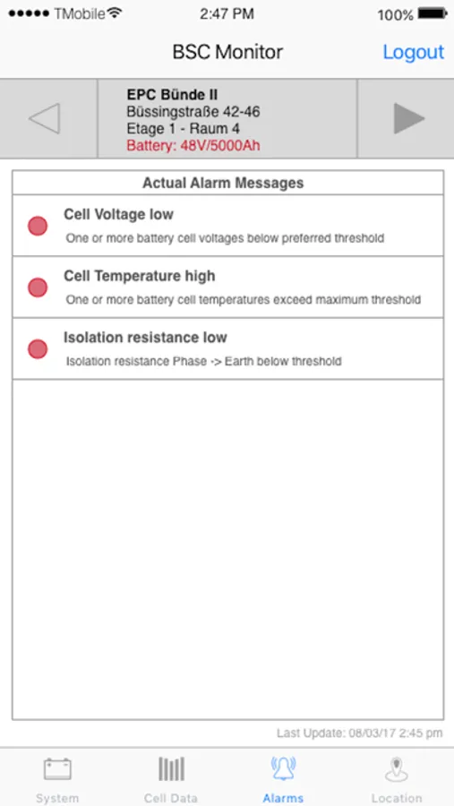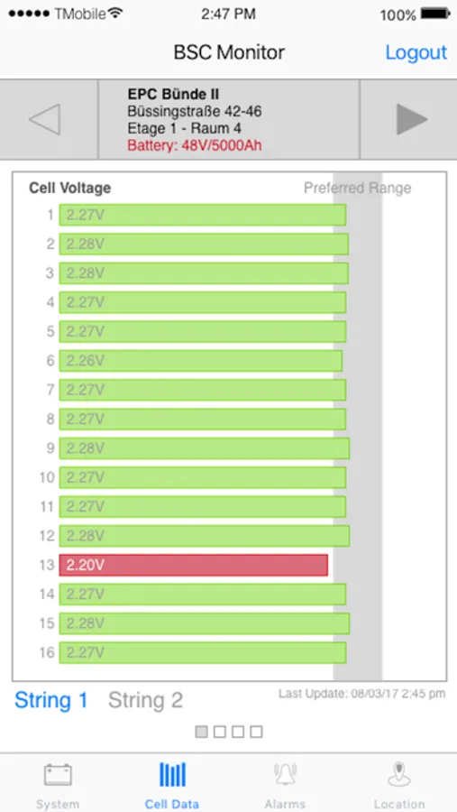 The BSC Wireless Battery Cell Monitor measures and monitors industrial battery systems down to the battery cell level. With this APP the customer can monitor and maintain the system remotely. All system and measuring data, which are permanently stored in the cloud database, are visible and can be analysed in realtime for each single system.
