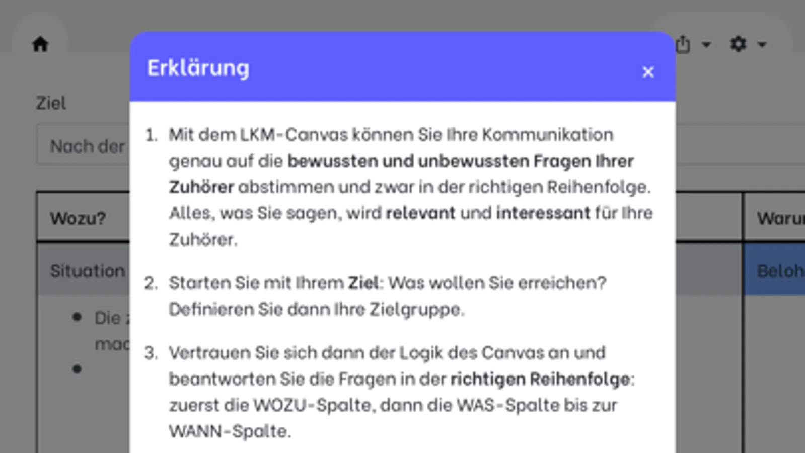 Diese App vereint also das Beste aus beiden Welten – der Gehirnforschung und der Rhetorik – zu einem neuen Kommunikationsmodell: dem Limbischen Kommunikationsmodell (LKM). Es mündet in einer einzigen, einfachen, effizienten Kommunikationsstruktur, dem LKM-Canvas. Für Ihre Praxis haben wir diese App entwicklelt mit der Sie Ihre Storyline prägnant, überzeugend und kreativ entwickeln können – ob alleine oder mit Ihrem Team.