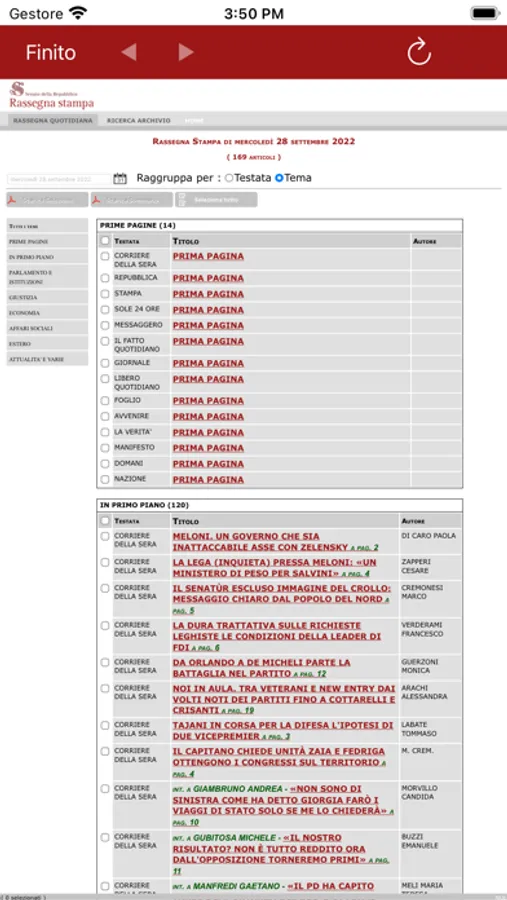 Lettura della Rassegna Stampa del Senato messa a disposizione dei Senatori.