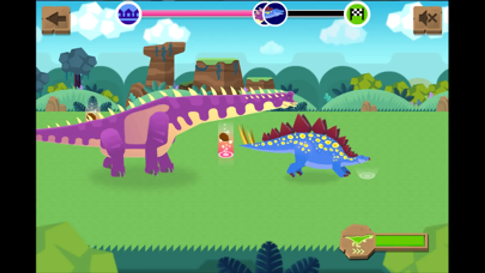 In each round, your dino races one-by-one against three other dinos. When you're faster than your opponents you unlock new racing dinos. After an easy start, you'll soon find yourself up against bigger, faster, stronger dinosaurs that are more challenging to beat. You can race: Tyrannosaurus rex, Troodon, Spinosaurus, Incisivosaurus,