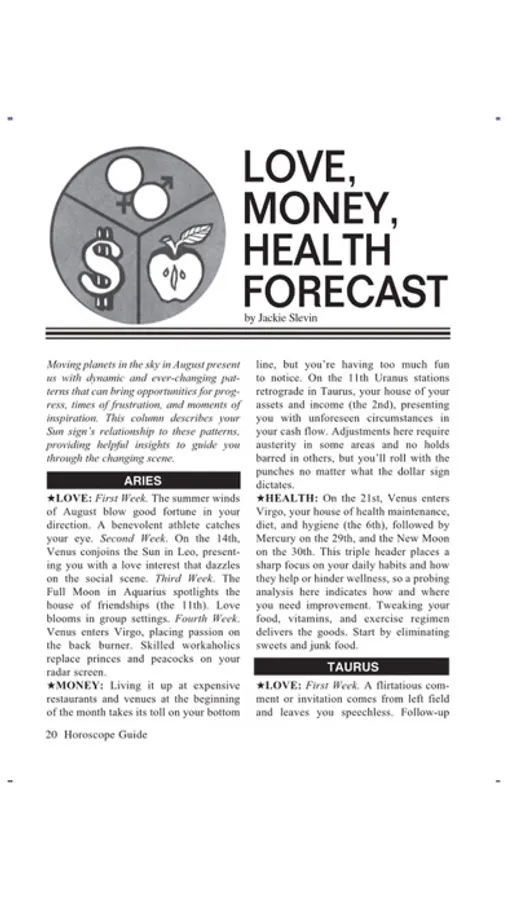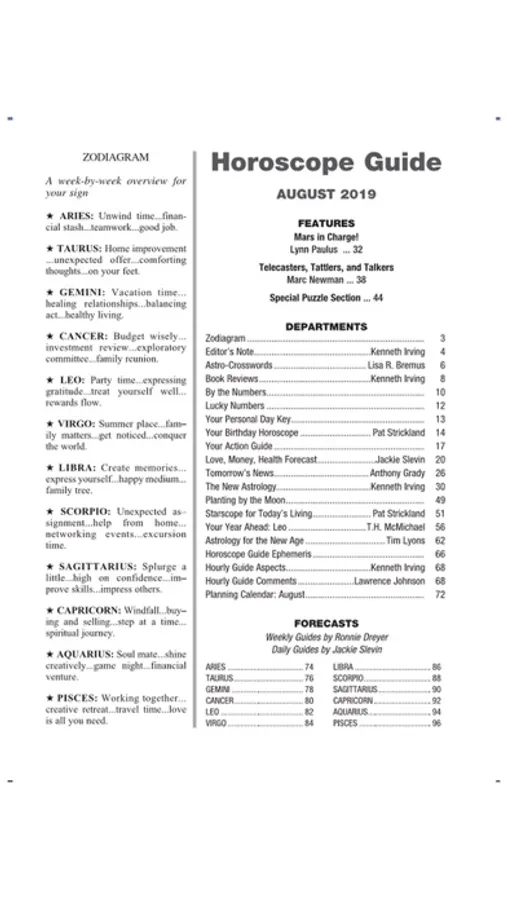 Horoscope Guide offers day-by-day forecasts for every sign as well as timely feature articles by top astrologers about different aspects of astrology and how they apply to the world around us. Each issue also includes regular features such as Lucky Numbers, Action Guide, Lunar Forecast, and much more.