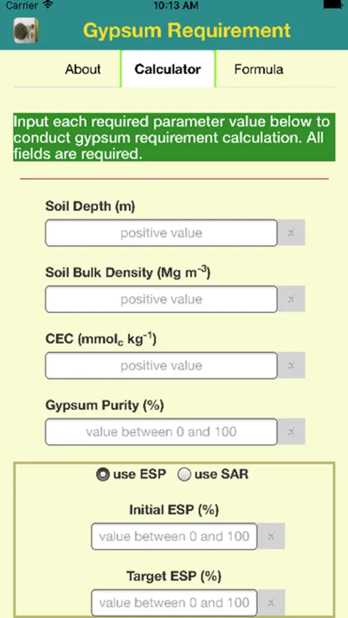 Easily enter values for initial and final ESP or SAR, soil bulk density, depth needed to be treated, efficiency, gypsum purity, and cation exchange capacity.
