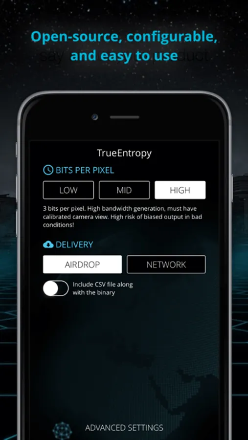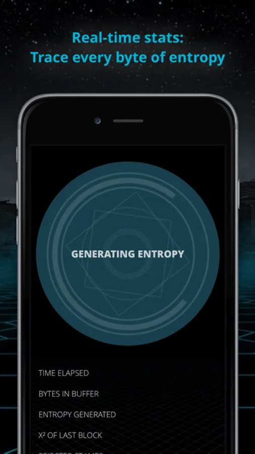TrueEntropy uses your phone's camera to generate true random numbers derived from thermal noise. The camera in your smartphone is so advanced that it can detect even the smallest variations produced by fundamental particle physics. We capture thermal variations in every pixel of your phone's camera to create a powerful, high volume entropy random number generator. No need to move your phone - even if your phone is resting on a desktop, it is able to pick up a sufficient quantity of thermal variations to generate random numbers at a rate of 18Mb per minute.
