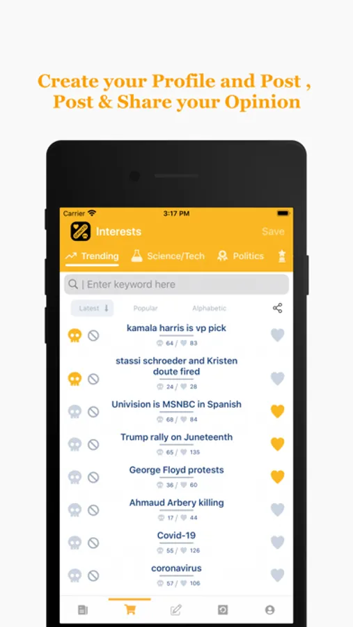 You’re even free to share photos, memes, videos, news articles etc. Express your love (by sharing a heart symbol) or hate (by sharing a skull) for any particular topic and leave the rest up to the Opinito app. It will automatically add news in your feeds according to your chosen topic.
