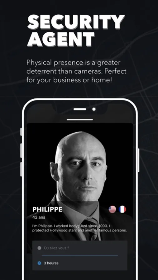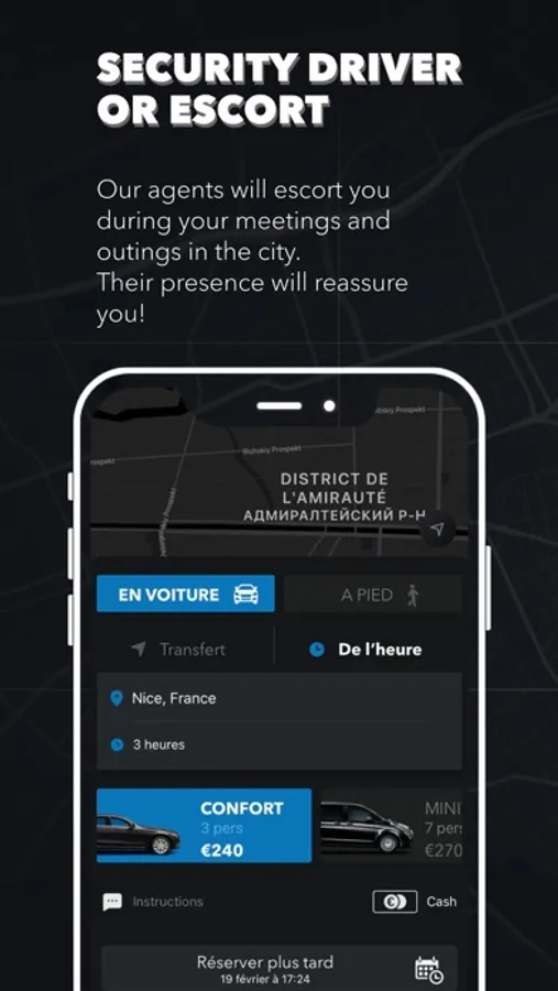 Click on the type of services offered, select the type of agent that suits you, whether for an outing with friends, a special evening and being escorted on foot or by car to feel safe.