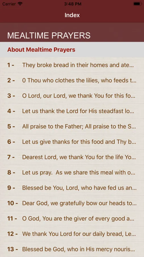 This Mealtime Prayers App provides 56 short prayers or thankful phrases (also called "grace") said before or after eating meals in Christian traditions. In English, reciting such a prayer is sometimes referred to as "saying grace". Some traditions hold that grace and thanksgiving imparts a blessing which sanctifies the meal.