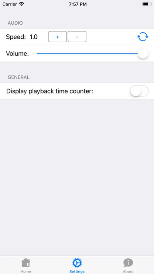 To change the relative volume, playback speed, or to toggle the display of the playback time counter, tap on the 'Settings' icon in the tab bar. Settings are automatically saved as soon as you make a change and will be reloaded the when you launch the app.