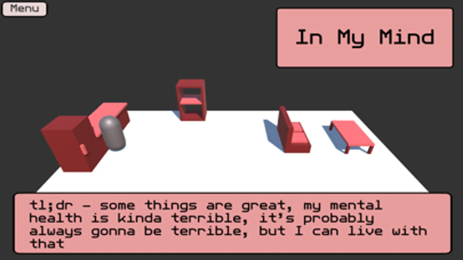 In My Mind is a small games experience designed to represent what it’s like living inside my head. The gameplay involves the player walking around a room and interacting with furniture to talk out loud to themselves. This is a direct representation of how I talk to myself to sort through various thoughts and problems I am having.