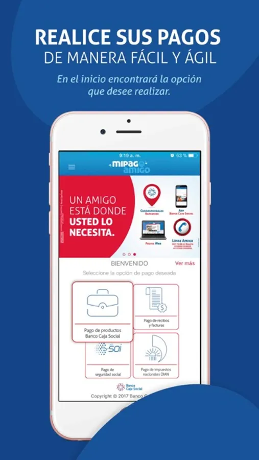 Banco Caja Social presenta mipagoamigo, una aplicación desarrollada para dispositivos móviles para realizar el pago de sus facturas, recibos, seguridad social y otros servicios de una manera fácil, ágil y segura.