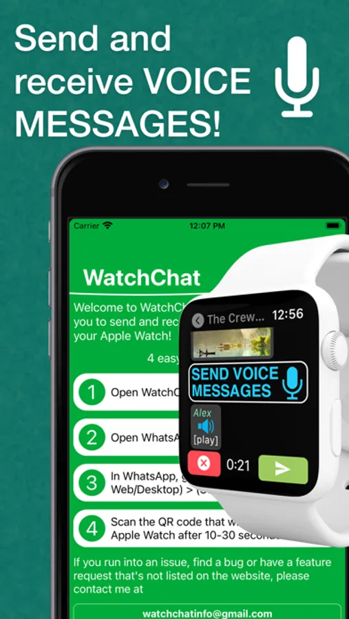 Since 2017, WatchChat is the fastest and most reliable app that allows you to send and receive WhatsApp messages on your Apple Watch. To offer the widest range of features and up-to-date technology the app has been updated more than 60 times in the past 3 years and we will continue to do so.