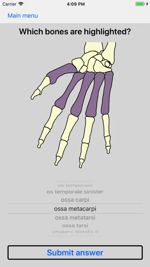 In Spin to learn an image with a highlighted bone is presented. You're supposed to select the correct name from a list of bones below the image. The list always contains the correct answer as well as bones with similar names. For example, if the bone trapezium is displayed the list always contains trapezoid as well. This makes sure that you learn to distinguish between bones that are easy to mix up.