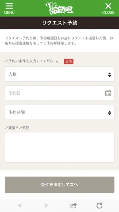 希望の人数・日時を指定して送信するだけで予約を依頼できます。
