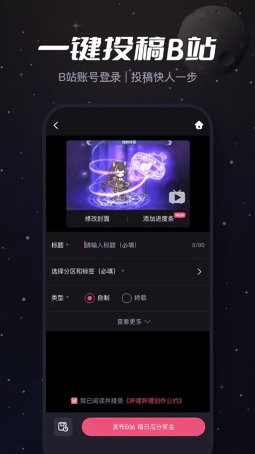 必剪是一款UP主都在用的剪辑神器,在这里你可以创建你的专属虚拟形象,实现0成本做虚拟UP主!还可体验高清录屏、游戏高光识别、神配图、封面智能抠图、视频模板、封面模板、批量粗剪、录音提词、文本朗读、语音转字幕、画中画、蒙版等功能,剪辑从此得心应手!还有超燃音乐、素材及专业画面特效,给视频加点料!一键投稿,支持投稿免流量,账号互通,投稿快人一步!