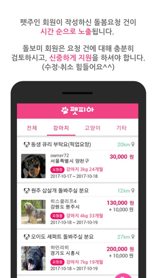 돌보미 회원가입 / 펫주인 회원가입(※양 쪽 모두 해당하실 경우, 돌보미 회원으로 먼저 가입하셔야 합니다. 이 때 2개의 이메일 계정이 필요하며 계정아이디를 각각 다르게 가입해야 합니다. 메모에 두시면 좋습니다^^) → 펫주인 회원의 돌봄요청 → 돌보미 회원의 돌봄지원 → (불가피한 경우에 만 수정·취소 가능) → 돌봄확정 → (상담 및 면담) → 돌봄거래 → 거래 후 소감·평가 각각 작성(정회원 게시판)
