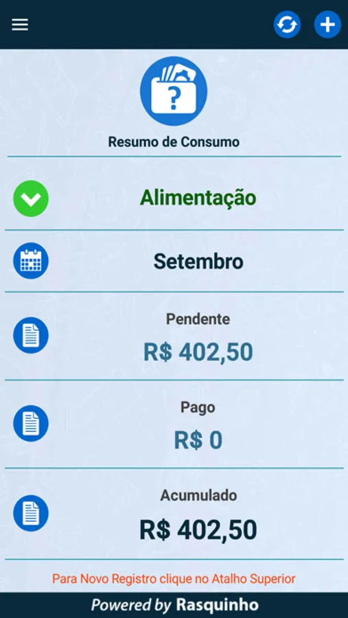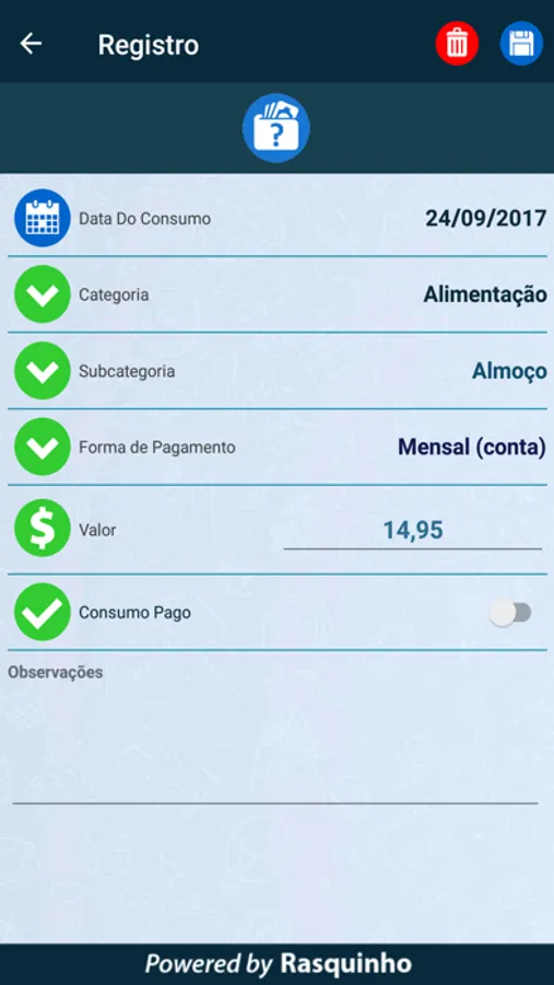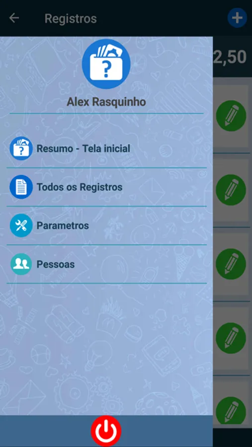 A idéia não é ser um App cheio de opções e parâmetros que possam causar demora no seu uso, logo ele conta apenas com parametrização de tipos de consumos e sub-categorias, formas de pagamentos e baixa de pagamentos pendentes(fiado), e ainda pode ser configurado para mais de um usuário.