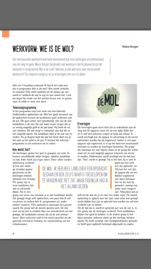 Euclides, het tijdschrift van de Nederlandse Vereniging van Wiskundeleraren, bespreekt wiskunde en didactiek voor het voorgezet onderwijs. Vmbo, havo en vwo komen aan de orde. Onderwerpen zijn bijvoorbeeld algebraïsche vaardigheden, wiskundig denken, didactiek, rekenen, geschiedenis van de wiskunde, gebruik van ICT, columns en reportages van collega's in het buitenland. Ook procedures rond het examen, examenbesprekingen en examenopgaven worden behandeld. De verenigingsactiviteiten zoals de jaarvergadering en de studiedag worden aangekondigd. De commissies en werkgroepen rapporteren in dit tijdschrift. Docenten voorgezet onderwijs en andere geïnteresseerden vinden hier veel informatie. Euclides wordt verspreid onder meer dan 3000 docenten en wordt gelezen door veel bij onderwijs betrokken personen.