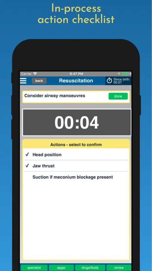Neonatal Resuscitation provides real time step by step guidance for neonatal resuscitation which follows the Advanced Life Support Group's Guidelines.