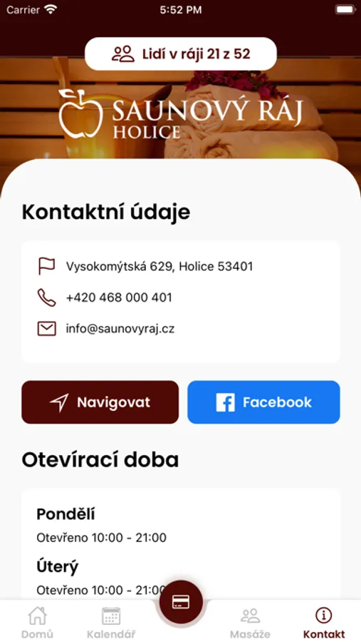 Užitečná aplikace pro všechny milovníky saunování v Saunovém ráji v Holicích, ve které snadno zjistíte kolik je aktuálně v sauně lidí, jak je dnes otevřeno, jestli jsou volné masérky nebo jestli pořádáme ceremoniály.
