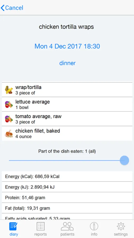 - If desired, the app provides insight into the nutritional value of the diet: based on the diary entries, the app calculates how much energy (calories), proteins, fats, minerals, vitamins the diet has provided.