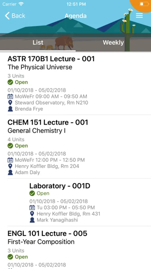 Did you find the perfect class, but aren't sure where it is located? Tap on the building name under the course details to open the Arizona Mobile app and be taken directly to the building on the map module.
