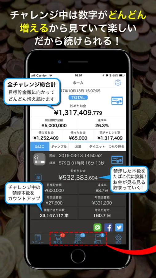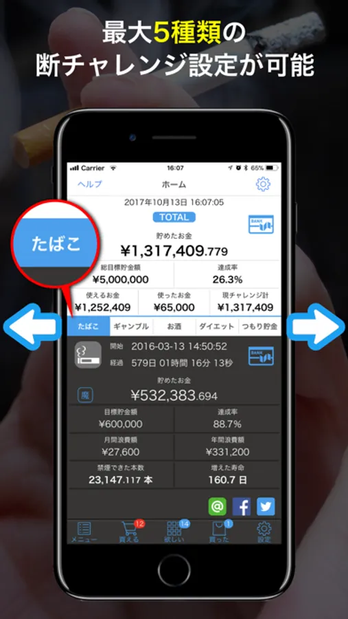 ギャンブル、煙草、お酒を断ったその瞬間から自動的にお金に換算してレコーディング!