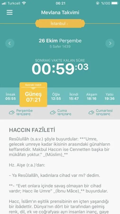 Türkiye il ve ilçelerine ait namaz vakitleri ve hicri takvim Diyanet İşleri Başkanlığı'ndan alınmıştır.