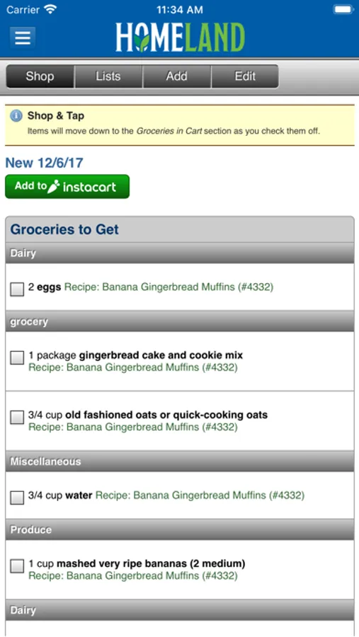 • Tap the list as you shop, and the item moves to “groceries in cart” at bottom of screen